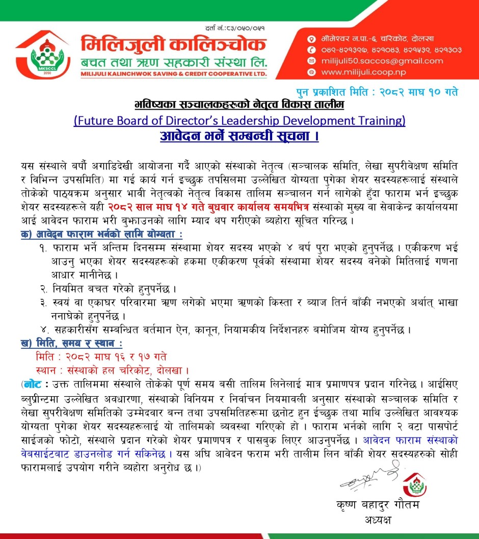 भविश्यका सञ्चालकहरुको नेतृत्व बिकास तालीमको आवेदन फाराम भर्ने सूचना